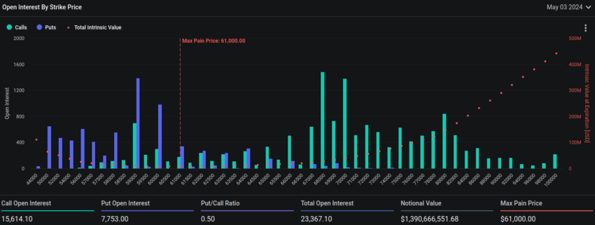 23.367 contratos de Bitcoin, no valor de US$ 1,39 bilhão, devem expirar hoje. De acordo com os dados da Deribit, a relação put-to-call é de 0,50. O ponto máximo – o preço pelo qual o ativo causará perdas financeiras ao maior número de detentores – é de US$ 61.000.