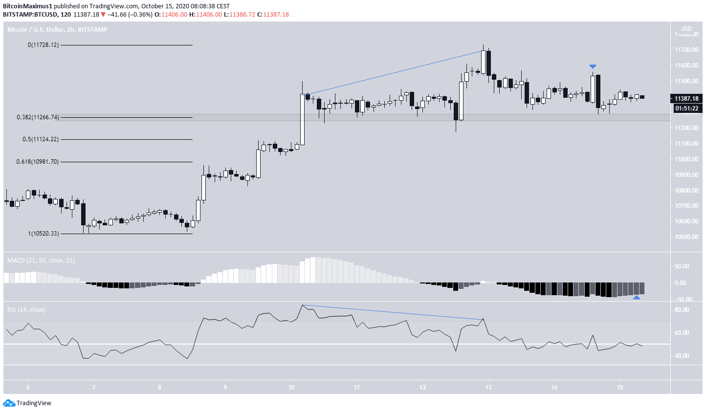 No dia 12 de outubro, o preço do BTC atingiu uma alta de $ 11.731. A alta foi combinada com divergência de baixa significativa no RSI de duas horas, e precedeu um aumento considerável que ainda está em andamento. Ao longo da queda, o preço roçou a área de suporte menor de $ 11.266, que coincide com o nível de 0,382 de Fibo de todo o movimento de alta. Os próximos níveis de suporte são encontrados entre $ 10.981 e $ 11.124.