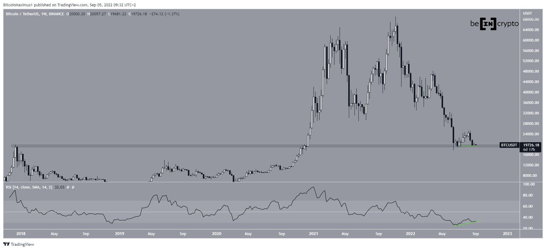 O Bitcoin se recuperou ligeiramente durante a semana de 28 de agosto a 5 de setembro, mas não o suficiente para iniciar qualquer tipo de reversão de tendência. No entanto, seu preço ainda está acima da área de suporte horizontal de US$ 19.500. Essa área já havia atuado como resistência durante o até então preço recorde de 2017 e novamente em dezembro de 2020.