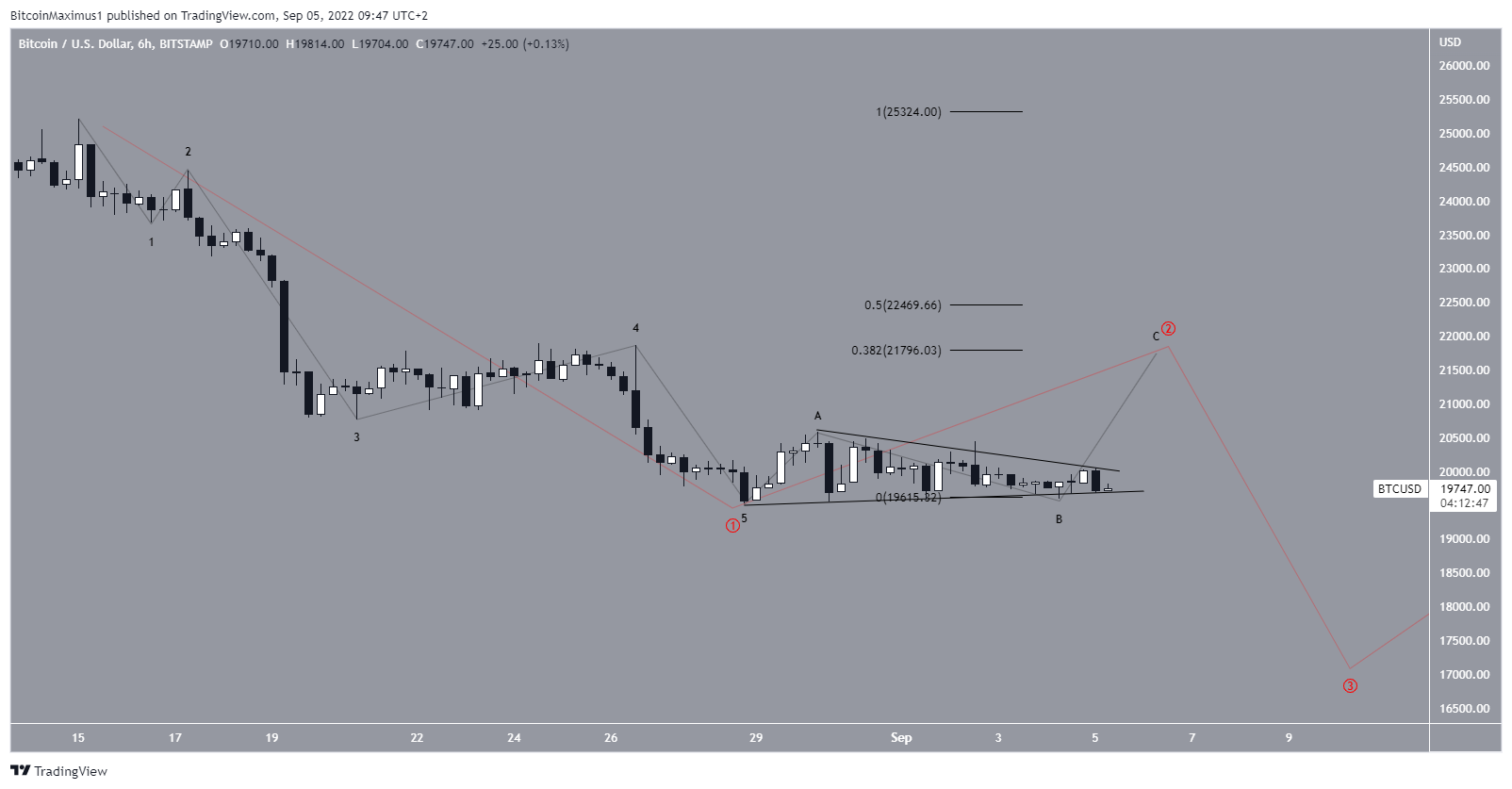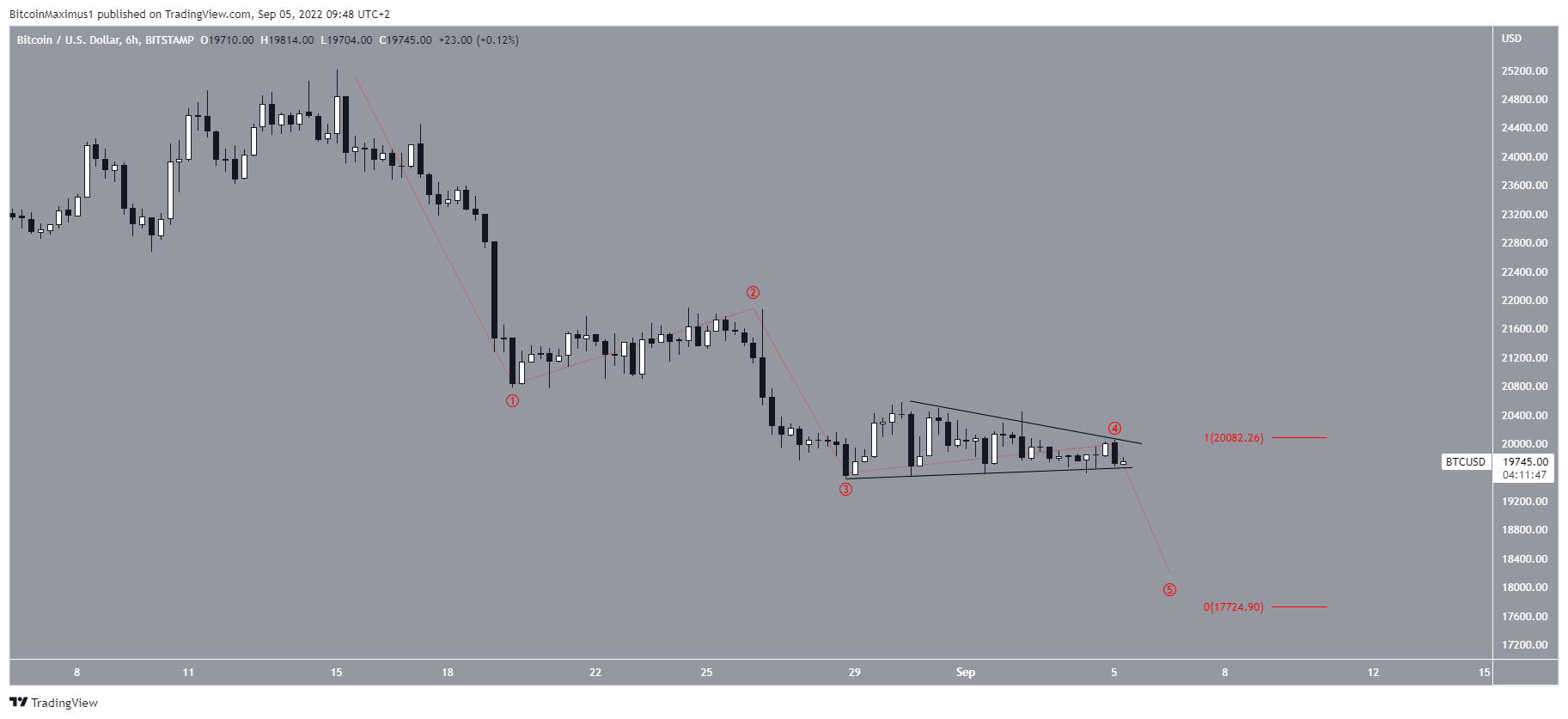 Existem duas contagens de ondas potenciais em jogo. A primeira sugere que o BTC completou a onda quatro de um movimento de queda de cinco ondas, daí a forma do triângulo simétrico. Nela, o preço do ativo pode cair ainda mais antes de se recuperar.