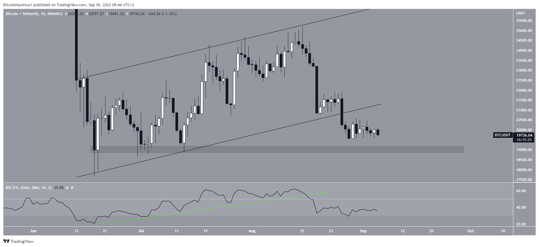 O gráfico diário mostra que o Bitcoin caiu abaixo de um canal paralelo de alta que estava em vigor desde as mínimas de junho. A queda também foi combinada com uma quebra diária do RSI de uma linha de tendência de alta (linha verde).