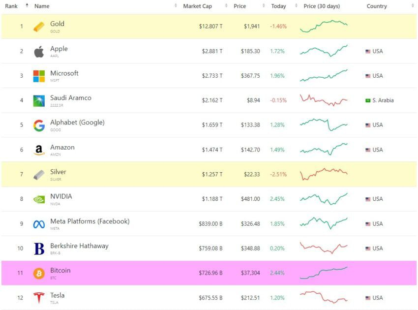 Com uma capitalização de mercado de US$ 726 bilhões, o BTC está agora “muito à frente” da Tesla. Por sua vez, a empresa de carros elétricos capitaliza aproximadamente US$ 675,55 bilhões.
