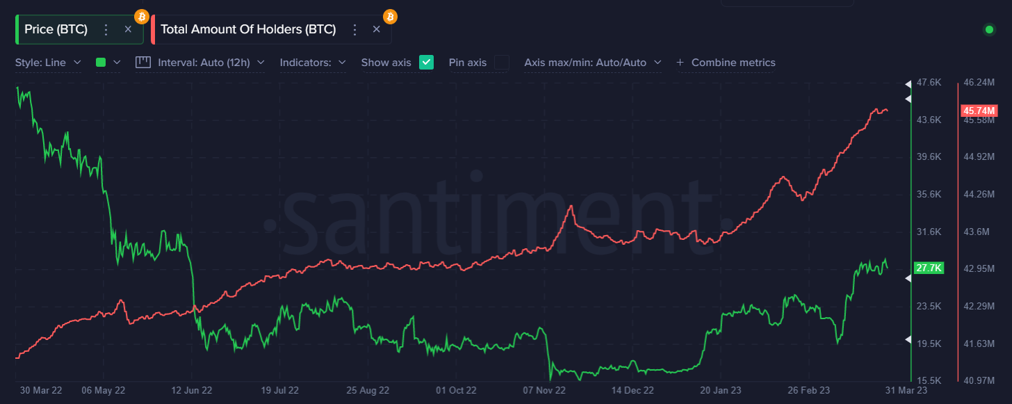 Se continuarmos a ver uma tendência crescente na quantidade total de detentores de Bitcoin no segundo trimestre de 2023, isso pode se traduzir facilmente em mais saltos de preço à frente.