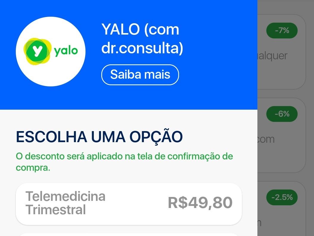 A contratação se dá pelo próprio aplicativo da Bitfy, que traz o serviço Yalo+ entre as opções da categoria “Saúde”. A assinatura inclui parceiros como Dr. Consulta, para consultas por a partir de R$ 40. Além disso, estão incluídos descontos de até 20% nas redes de farmácias Droga Raia e Drogasil.