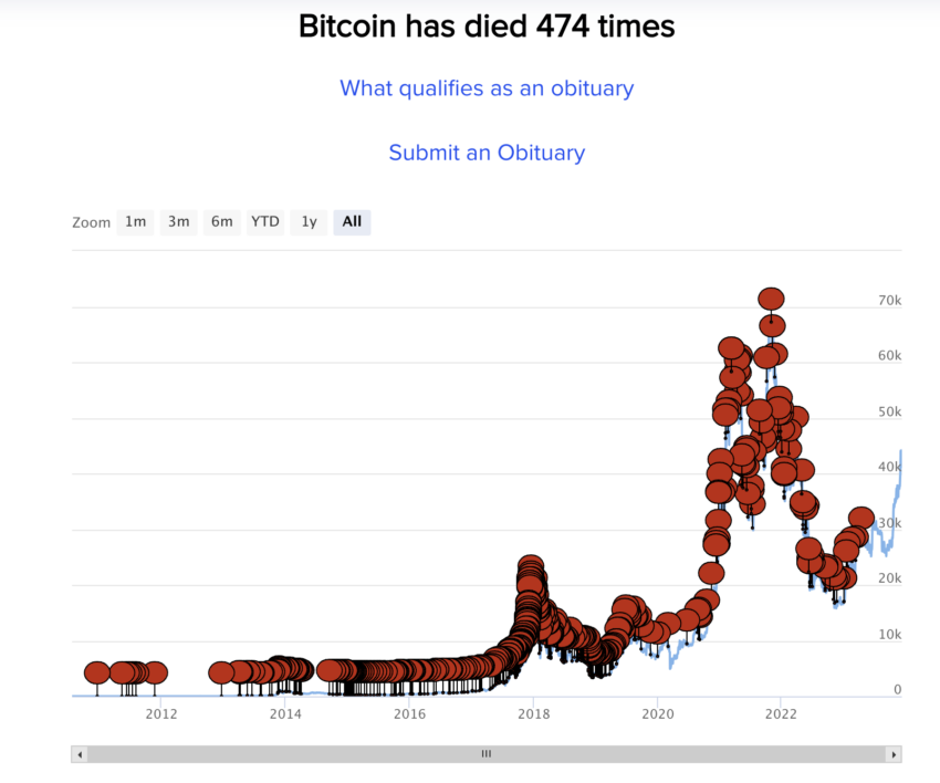 Ao longo de 13 anos, o Bitcoin foi declarado morto pelo menos 474 vezes. Em novembro de 2023, o conhecido autor indiano Chetan Bhagat escreveu uma coluna declarando que a criptomoeda estava morta.