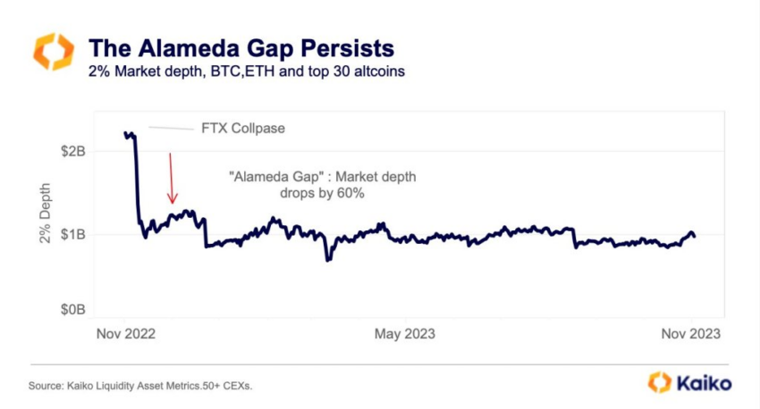 Após o colapso da FTX, a Alameda Research, o braço comercial do império de Sam Bankman-Fried, também entrou em colapso. Como resultado, a “profundidade do mercado” caiu 60% e o Bitcoin ainda não se recuperou.