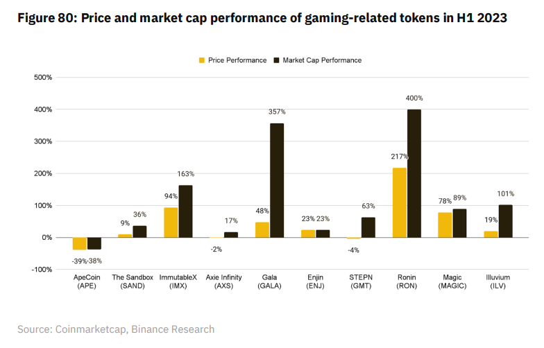 O gráfico abaixo demonstra o desempenho dos 10 principais tokens relacionados a jogos. A maioria mostrou um desempenho positivo no primeiro semestre de 2023.