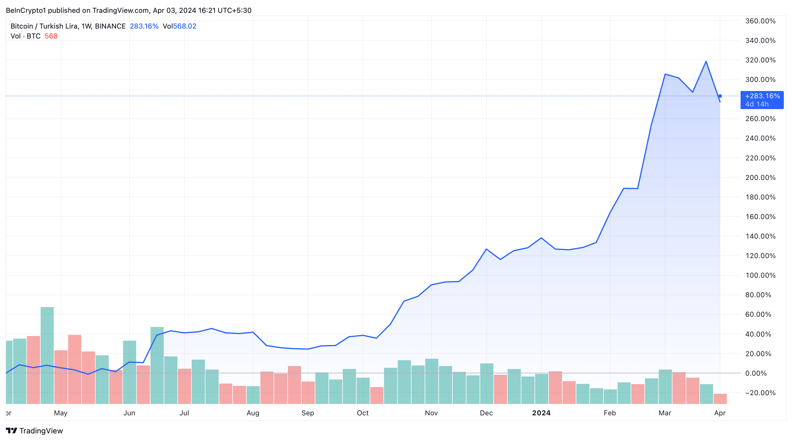 Na Turquia, a inflação crescente chegou a 68,5% em março, um aumento acentuado que impulsionou o Bitcoin para perto de sua máxima histórica em relação à lira turca.
