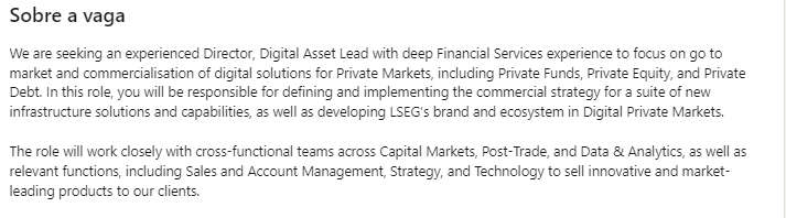“Estamos procurando um Diretor experiente, Líder de Ativos Digitais com profunda experiência em Serviços Financeiros para nos concentrar na entrada no mercado e na comercialização de soluções digitais para Mercados Privados, incluindo Fundos Privados, Private Equity e Dívida Privada.”