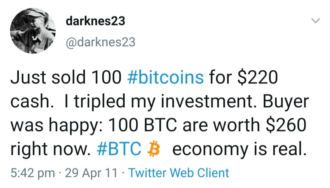 Outro, se orgulha em anunciar, também em 2011, de vender 100 BTC pelo valor de US$ 220, tendo triplicado o seu investimento inicial.