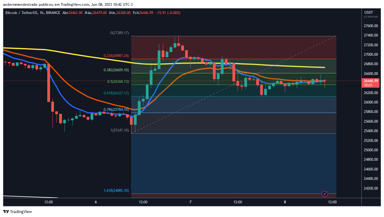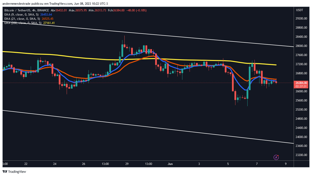 No gráfico de quatro horas, o cenário se torna mais pessimista. Isso porque a EMA de 200 períodos não está atuando como suporte, mas sim como resistência de preço – atualmente em US$ 27.200.