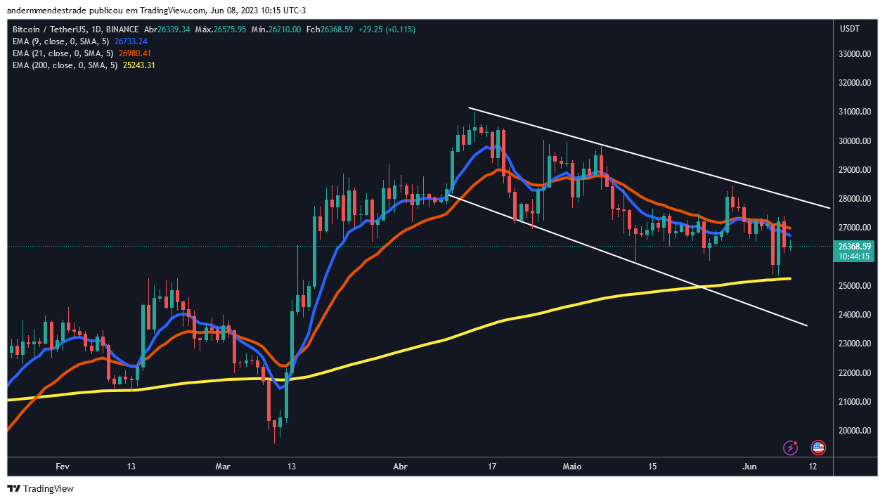 Por sua vez, se o preço perder o suporte da EMA de 200 períodos, é possível que caia abaixo do canal, podendo ir testar novamente a região de US$ 20.000.