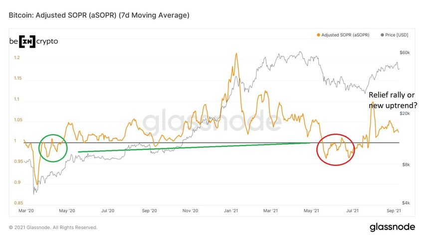 Conforme analisado, um movimento acima da linha 1 após uma quebra pode ser um rali de alívio se o SOPR não puder se manter acima de 1. Portanto, se o mercado estiver em um estado de lucro por um longo período de tempo (verde) e então passa para um estado de perda (círculo vermelho), é um sinal de uma possível reversão da tendência de baixa. Se o mercado voltar a um estado de lucro, mas depois voltar a perder, isso confirma a reversão da tendência de baixa.