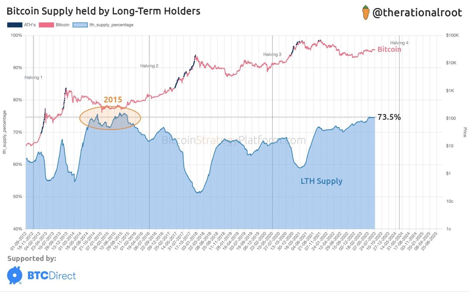 O conhecido analista de mercado de criptomoedas @therationalroot twittou um gráfico sobre a oferta de Bitcoin nas mãos do LTH em relação ao fornecimento total disponível. Ele observou que o percentual atual de oferta de longo prazo é de 73,5% e está se aproximando da sua máxima histórica de 2015.