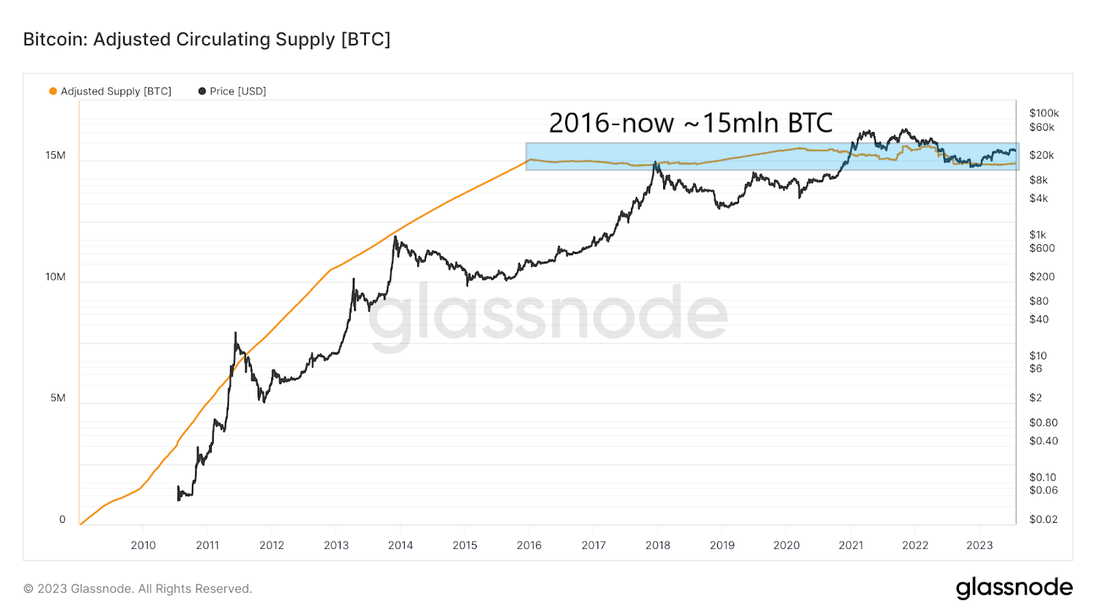 Dessa forma, a métrica de oferta circulante ajustada leva em consideração as moedas perdidas. Como visto abaixo, a quantidade de BTC em circulação permaneceu relativamente constante em cerca de 15 milhões de unidades desde o início de 2016. Isso apesar do fato de quase 19,5 milhões de BTC terem sido minerados até agora. Portanto, até 4,5 milhões de moedas são consideradas perdidas.
