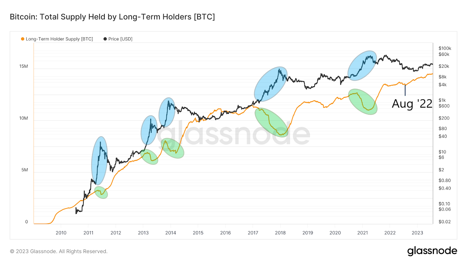 Com os dados on-chain, é possível ver a oferta de Bitcoin está nas mãos dos LTHs a qualquer momento. A métrica de Long-Term Holder Supply fornece esse gráfico. Em primeiro lugar, podemos ver que a oferta em posse desses usuários tem aumentado constantemente e, pelo menos desde agosto de 2022, vem registrando consistentemente novas máximas históricas (ATH).