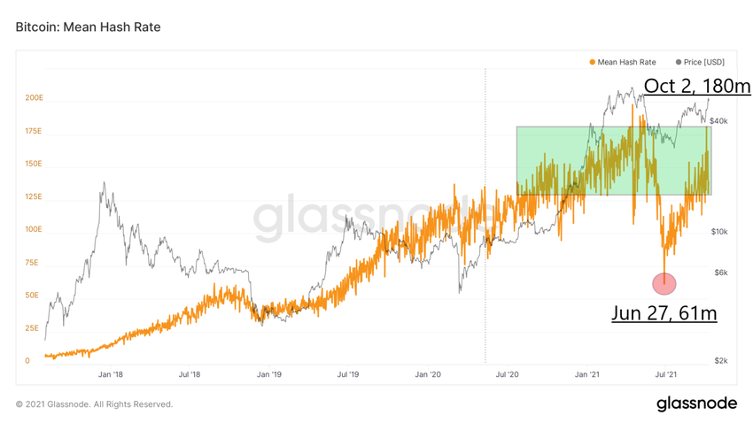 No entanto, a rede BTC provou mais uma vez sua robustez e a taxa de hash está crescendo dinamicamente desde então. Nos últimos dias, seu valor voltou aos picos alcançados no final de 2020 e início de 2021 (retângulo verde). No dia 2 de outubro, ela atingiu 180 milhões de TH/s, o que é quase três vezes maior do que a baixa de junho.