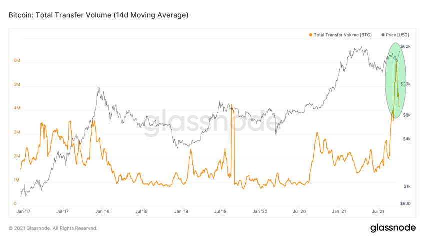 Além disso, a análise aponta para a aceleração do volume total de transferência de BTC on-chain, que atingiu o máximo em cinco anos. Tudo isso no contexto da alta do preço do Bitcoin, que está se recuperando fortemente e retomando sua alta em direção a uma nova alta de todos os tempos.