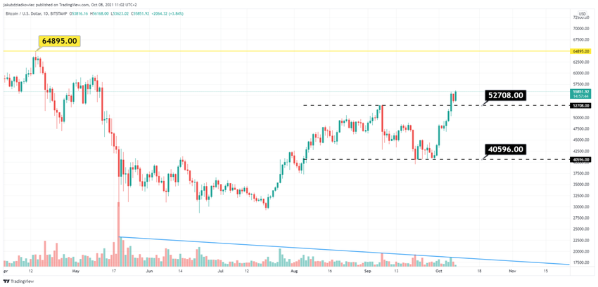 O intervalo de consolidação foi interrompido no dia 6 de outubro e, no momento da publicação, o BTC está se aproximando de US$ 56.000. Portanto, um rompimento acima do pico no dia 6 de setembro em US$ 52.810 é um sinal de alta que pode levar a uma continuação da tendência de alta em direção à nova máxima histórica. No momento, o BTC está cerca de 20% abaixo dessa meta.