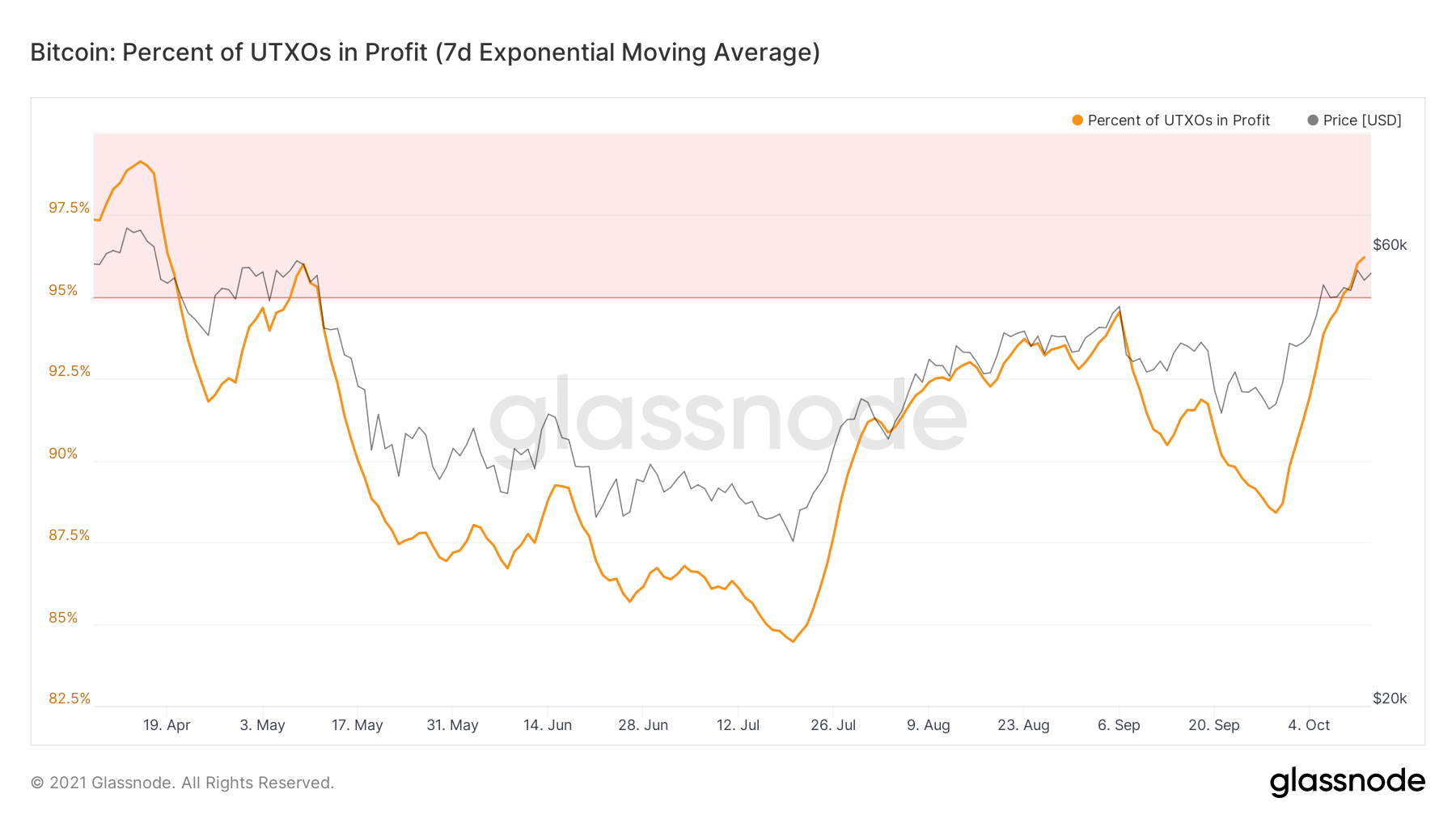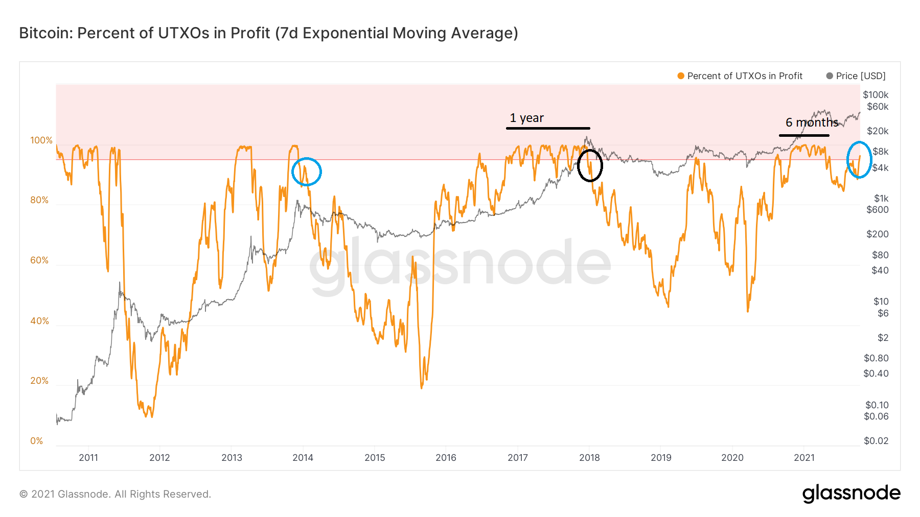Uma maneira interessante de analisar o indicador é medindo o período de tempo em que mais de 95% dos UTXOs tiveram lucro (linha vermelha).