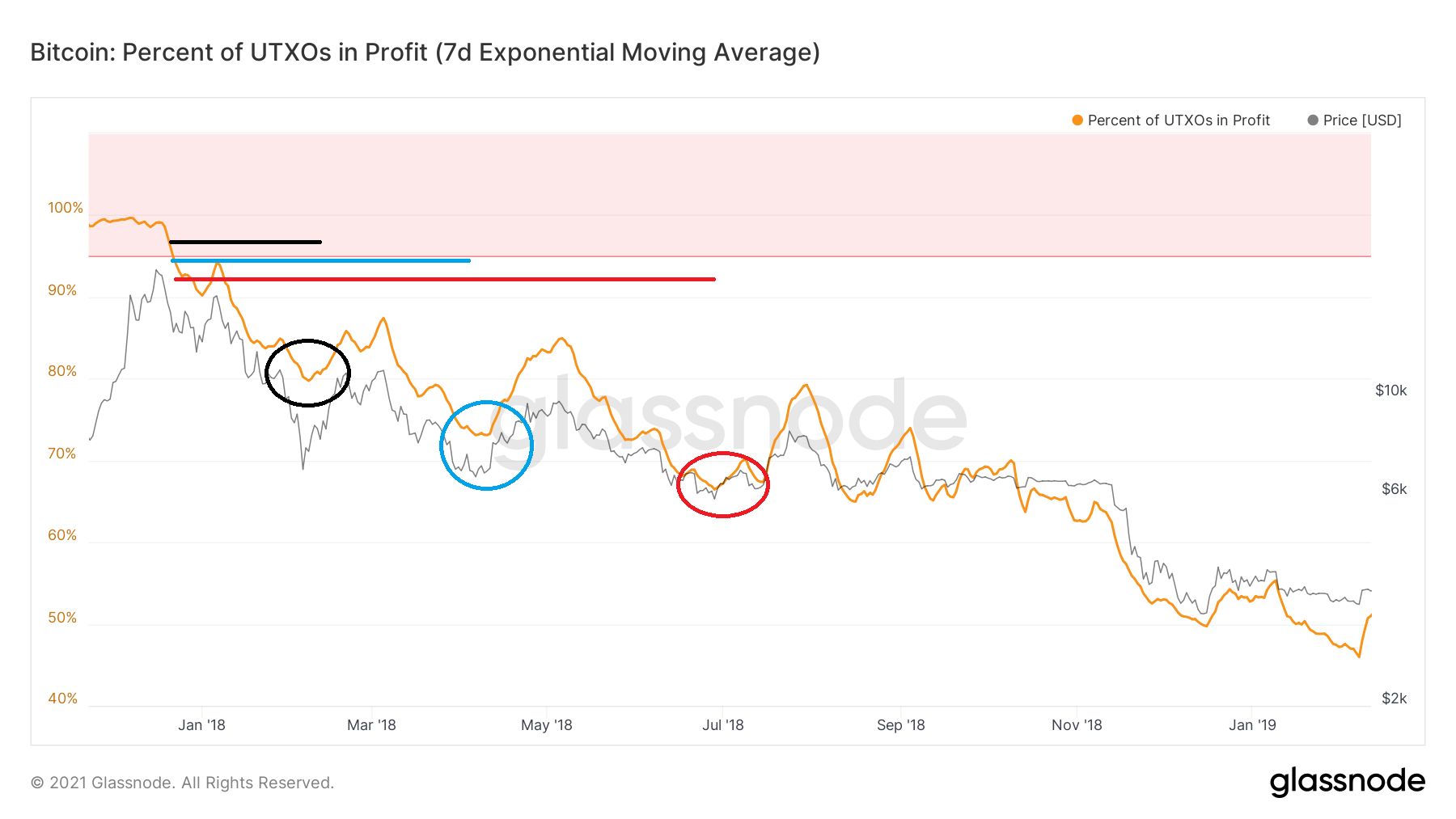 Ao comparar o movimento de queda em 2017 com a correção mais recente, o que imediatamente chama a atenção é o quão nítido o primeiro foi em comparação com o último. A porcentagem de UTXOs no lucro caiu para 80% apenas dois meses depois de cair para menos de 95% (círculo preto).