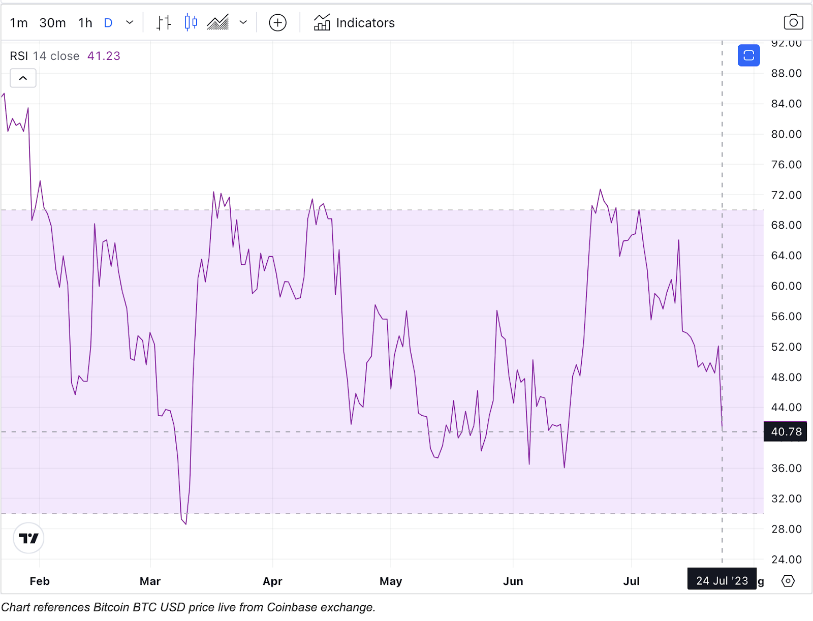 Conforme mostrado abaixo, o RSI diário atualmente está em 41. Isso significa que está mais próximo da marca de sobrevenda em 30 do que do território de sobrecompra em 70.