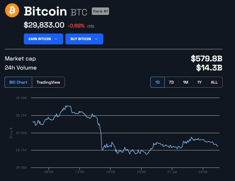 O Bitcoin não conseguiu manter seu preço acima de US$ 30.000 e recuou 1% no dia. Como resultado, o ativo era negociado a US$ 29.830 no fechamento da matéria.