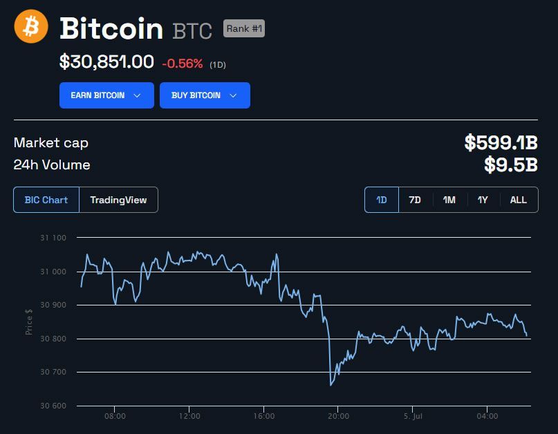 O Bitcoin atualmente é negociado a US$ 30.851, operando em queda no dia de hoje. Seu preço vem consolidando em torno do nível de US$ 30.000 desde 21 de junho.