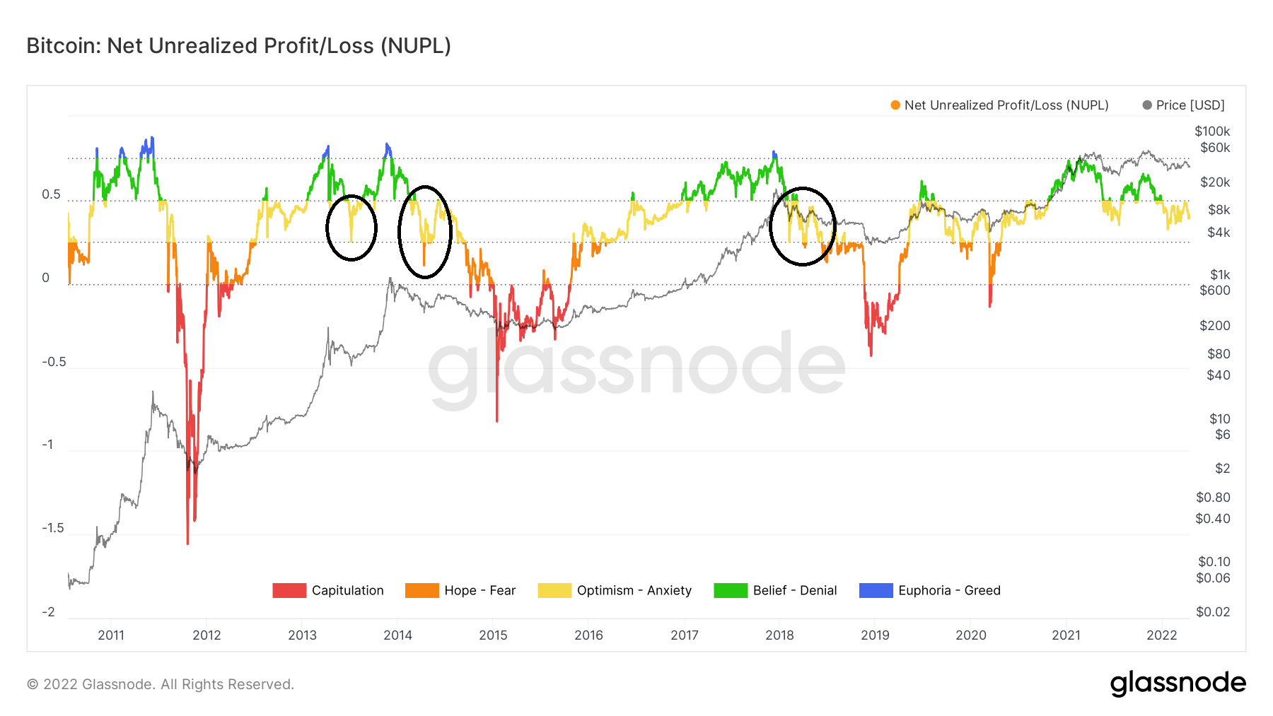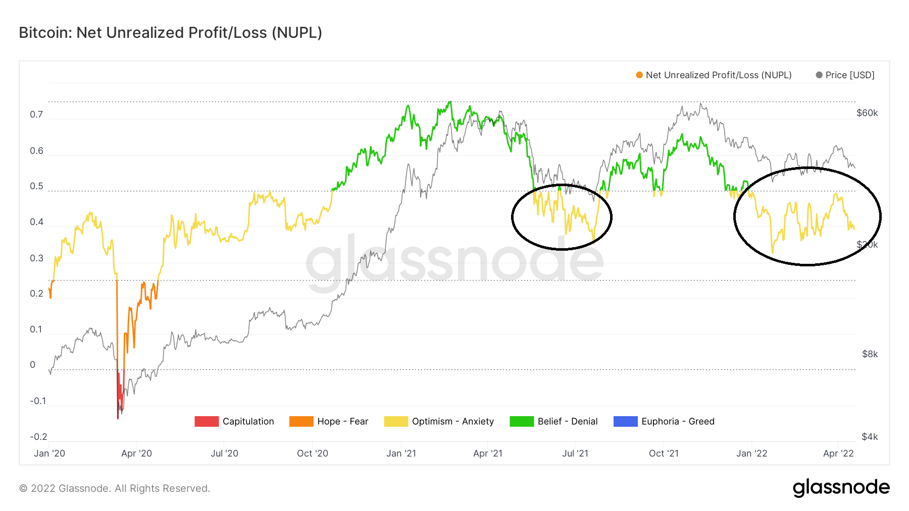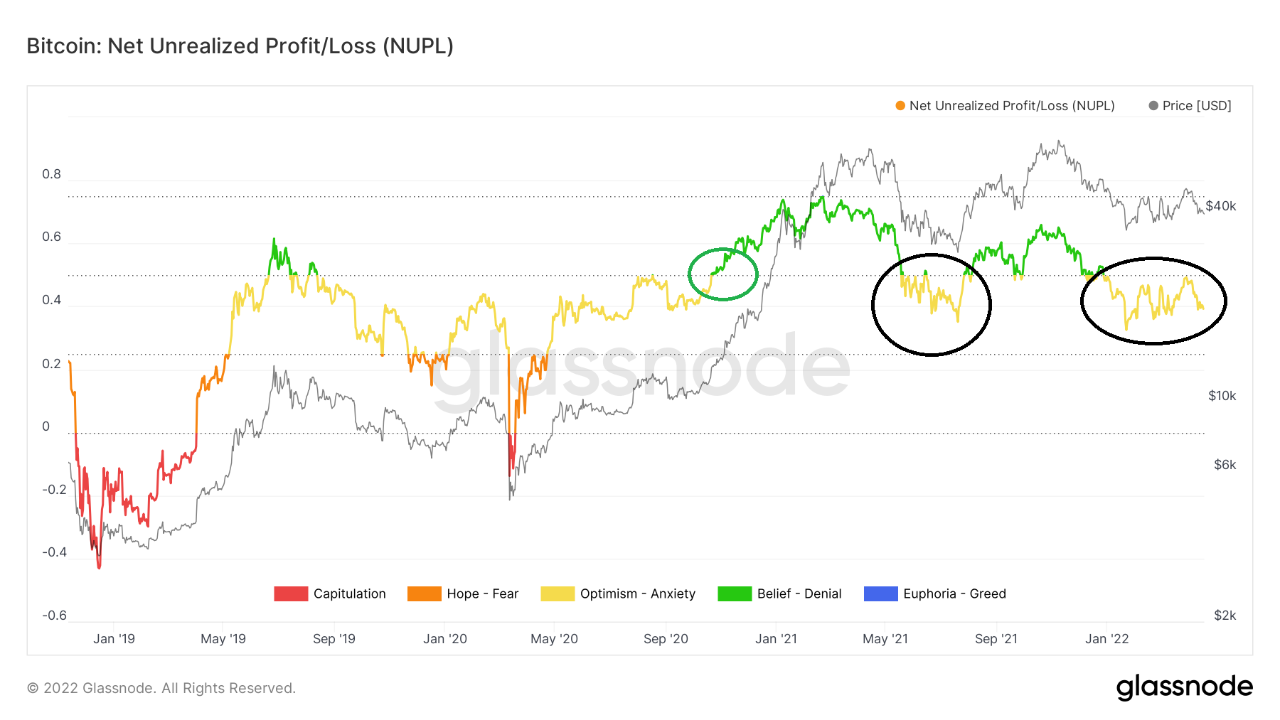 Até agora, o NUPL se moveu abaixo da linha de 0,5 duas vezes, em maio de 2021 e 22 de janeiro (círculos pretos) de 2022, respectivamente. A julgar pelo histórico anterior, é possível que o preço faça outra tentativa atingir uma nova máxima histórica. Isso provavelmente faria com que o NUPL subisse acima de 0,5 mais uma vez.