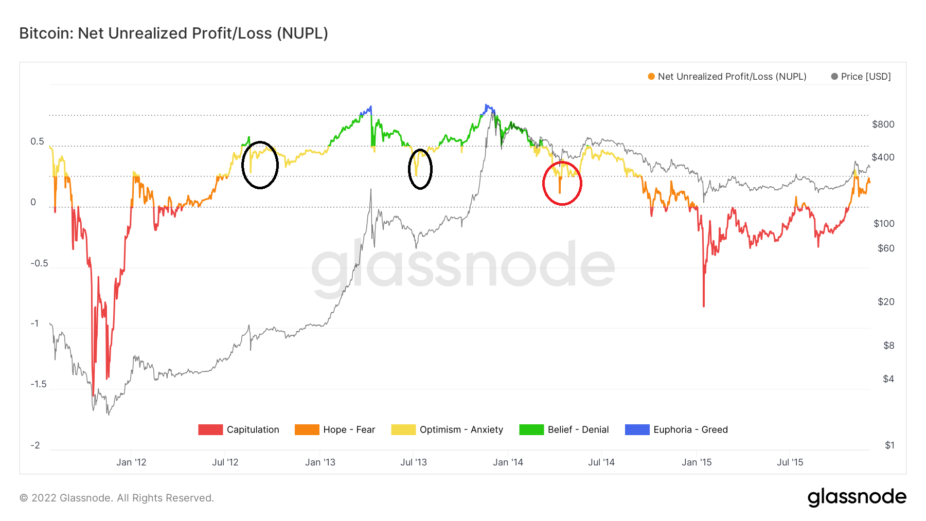 Em agosto de 2012, o NUPL moveu-se brevemente acima de 0,5, mas caiu abaixo desse nível quase imediatamente depois (círculo preto). Isso, no entanto, não marcou o início da correção de preço do Bitcoin. Em vez disso, o NUPL continuou a subir junto com o preço do BTC, que atingiu um novo recorde histórico na época.