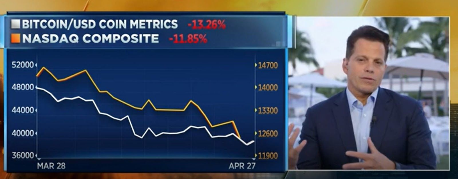 Durante sua aparição no programa da CNBC, Scaramucci também respondeu a perguntas sobre a correlação de preços entre ações de empresas de tecnologia e as criptomoedas. Até o final de março e a maior parte de abril, os dois gráficos se espelharam fortemente, como costumavam fazer no passado.