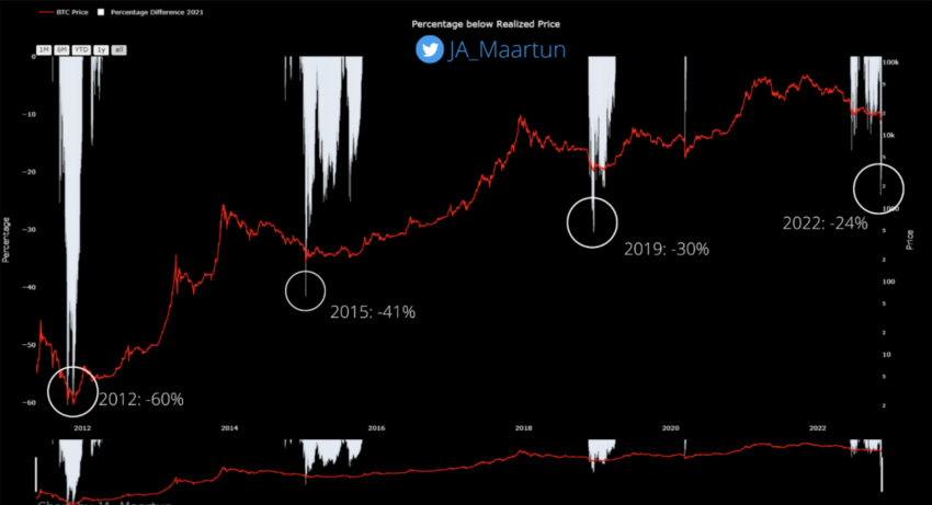 Olhando para a diferença percentual entre o preço do Bitcoin e seu preço realizado, fica evidente que a diferença é reduzida a cada ciclo. Em 2012, a diferença foi de 60%, enquanto em 2015 foi de 41%. Em 2019 a diferença foi de 30%, enquanto em 2022 o preço do Bitcoin está negociado 24% abaixo do preço realizado.