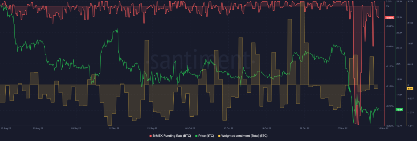 Notavelmente, a taxa de financiamento da BitMEX estava em território negativo, enquanto o sentimento ponderado também era negativo.