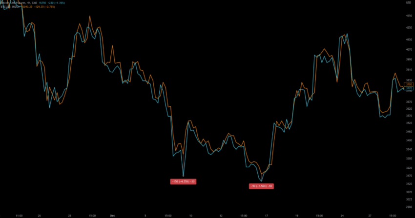 Notavelmente, os preços mínimos anteriores do BTC desde 2017 seguiram um padrão semelhante. O gráfico abaixo mostra desvios semelhantes em dezembro de 2018.