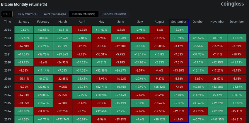 O desempenho do Bitcoin em setembro costuma ser fraco, com queda média de 3,60% desde 2013, segundo dados da Coinglass. Porém, este ano, o cenário tem sido diferente após um aumento acumulado superior a 9%.