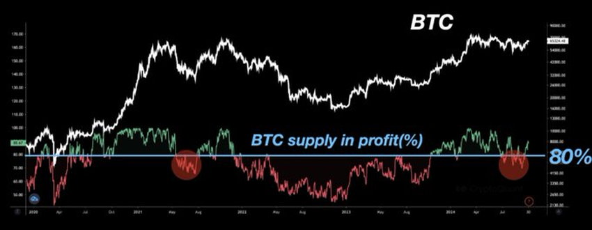 Por outro lado, uma análise recente da CryptoQuant destaca que atualmente mais de 80% da oferta de Bitcoin é proveniente de lucros.