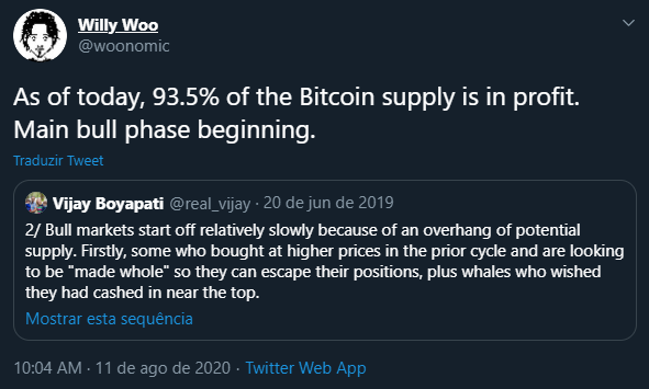 Segundo o analista Willy Woo, o Bitcoin acaba de entrar na “fase principal do rali”. O motivo seria a chegada de 93,5% da oferta de BTC ao patamar de lucro. Essa é a quantidade de Bitcoin comprada por preço menor que o atual.