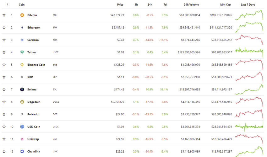 Outras criptomoedas estão perdendo ainda mais. A maioria deles perdeu cerca de 30% de seu valor. O único altcoin entre os dez maiores que não está preocupado com as quedas e continua a subir é Solana (SOL).