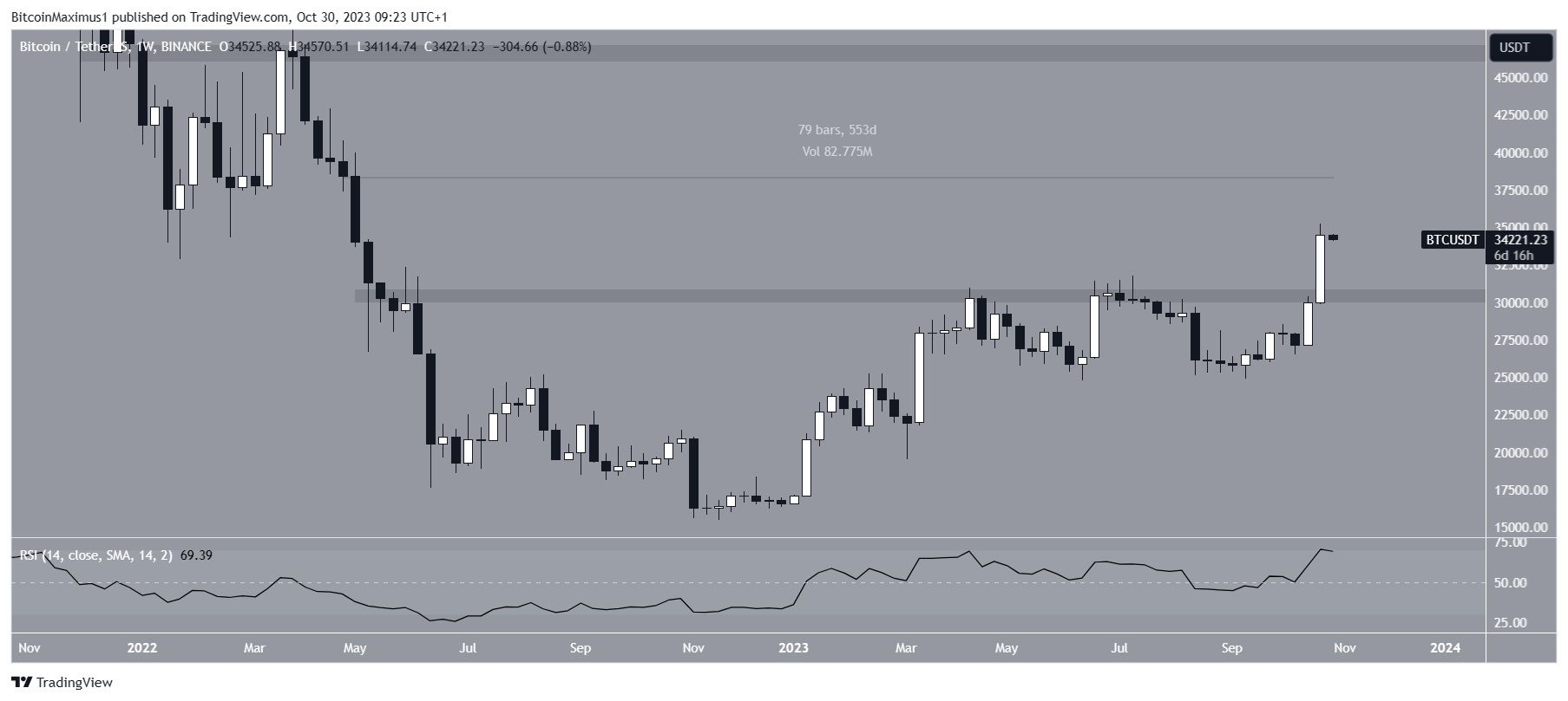 Embora tenha caído ligeiramente em seguida, o preço atingiu um fechamento semanal de US$ 34.525. Este foi o fechamento semanal mais alto desde que o ativo fechou em US$ 38.468 em abril de 2022.
