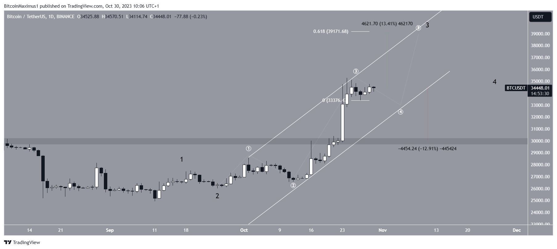 A contagem provável sugere que o Bitcoin está na terceira onda de um movimento de alta de cinco ondas (preto). A contagem de subondas é dada em branco, sugerindo que o preço está na subonda quatro, o que é corretivo.
