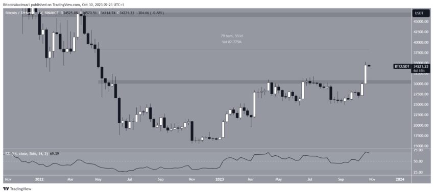 O preço também rompeu acima da principal área de resistência horizontal de longo prazo em US$ 30.500, que estava em vigor desde maio de 2022.