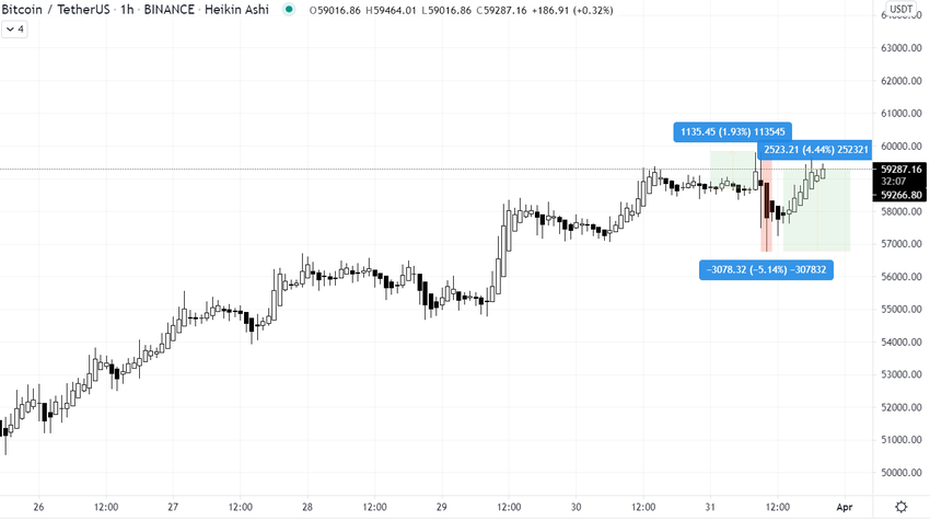 Apesar disso, os ursos tiveram muito pouco tempo para comemorar porque o BTC não demorou para recuperar seu preço e subir para US$ 59 mil. Liquidando, novamente, todos os traders que haviam mudado suas posições para um viés de baixa.