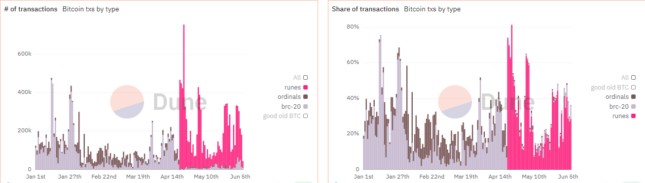 Desde seu lançamento, o Runes registrou pelo menos 150.000 transações diárias. Assim, destronando o BRC-20 que agora luta para atingir 10.000 transações.