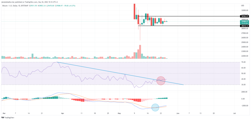O Bitcoin (BTC) está em uma tendência lateralizada desde sua forte queda em 12 de maio. Essa consolidação está ocorrendo na área entre US$ 28.600 e US$ 30.700, com o BTC realizando fortes movimentos ao atingir o fundo e o topo desse intervalo de preço.