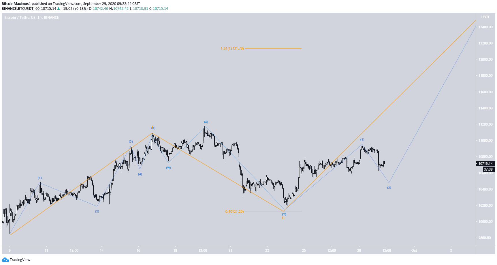 A contagem de sub-ondas mostra que o BTC está atualmente corrigindo na sub-onda 2, que está acontecendo dentro de uma formação A-B-C (mostrada em vermelho abaixo). A formação deve terminar entre os níveis de 0,5 e 0,618 de Fibo entre $ 10.450- $ 10.550, mas sua forma exata depende se a porção A tem três ou cinco ondas.