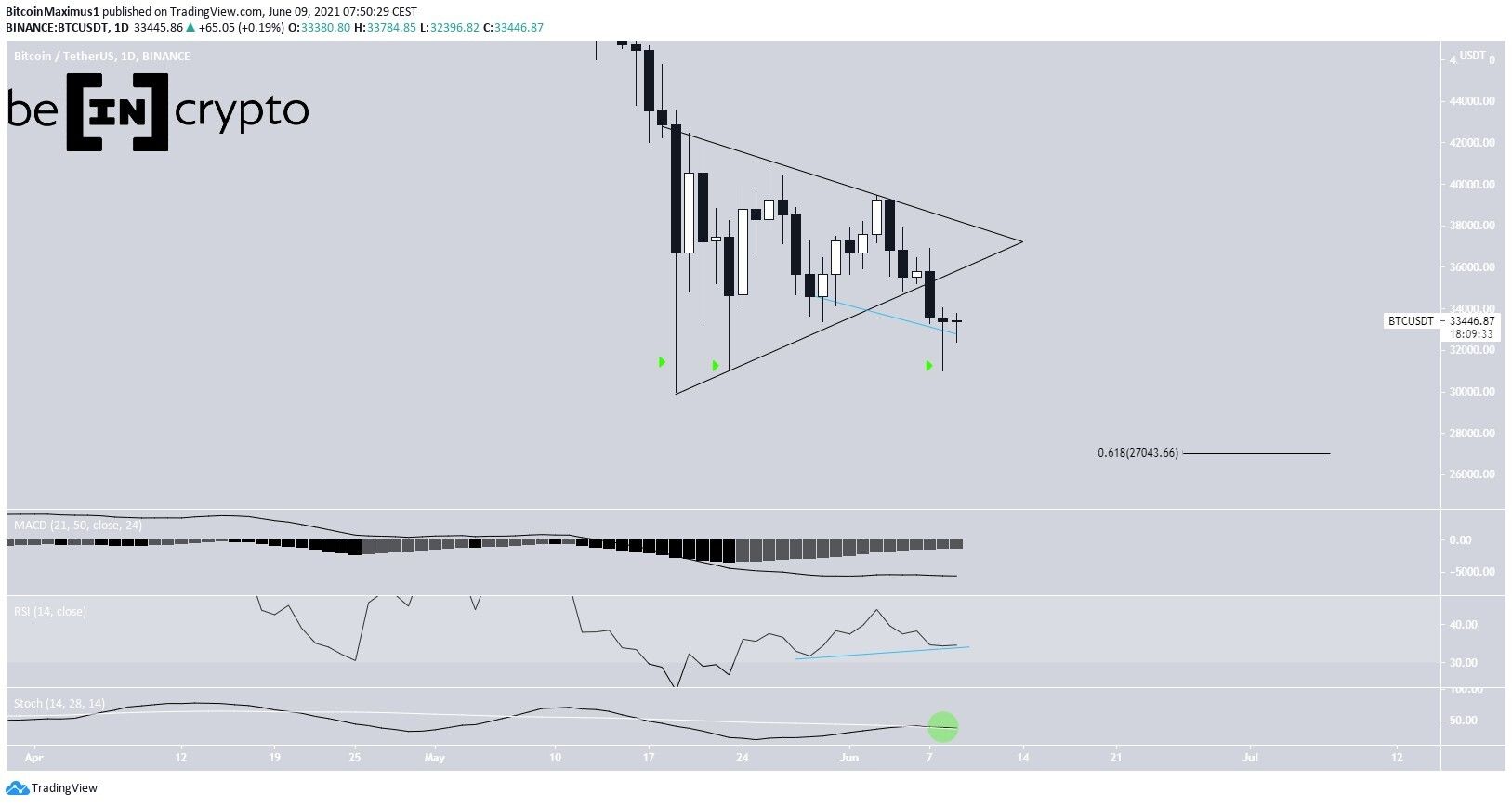 Segundo o analista de criptomoedas Valdrin Tahiri, o Bitcoin quebrou um importante suporte de um triângulo na última segunda-feira (7), conforme destacado no gráfico abaixo, algo considerado como negativo. Com isso, a moeda atingiu seu menor preço de fechamento desde o início de janeiro deste ano.