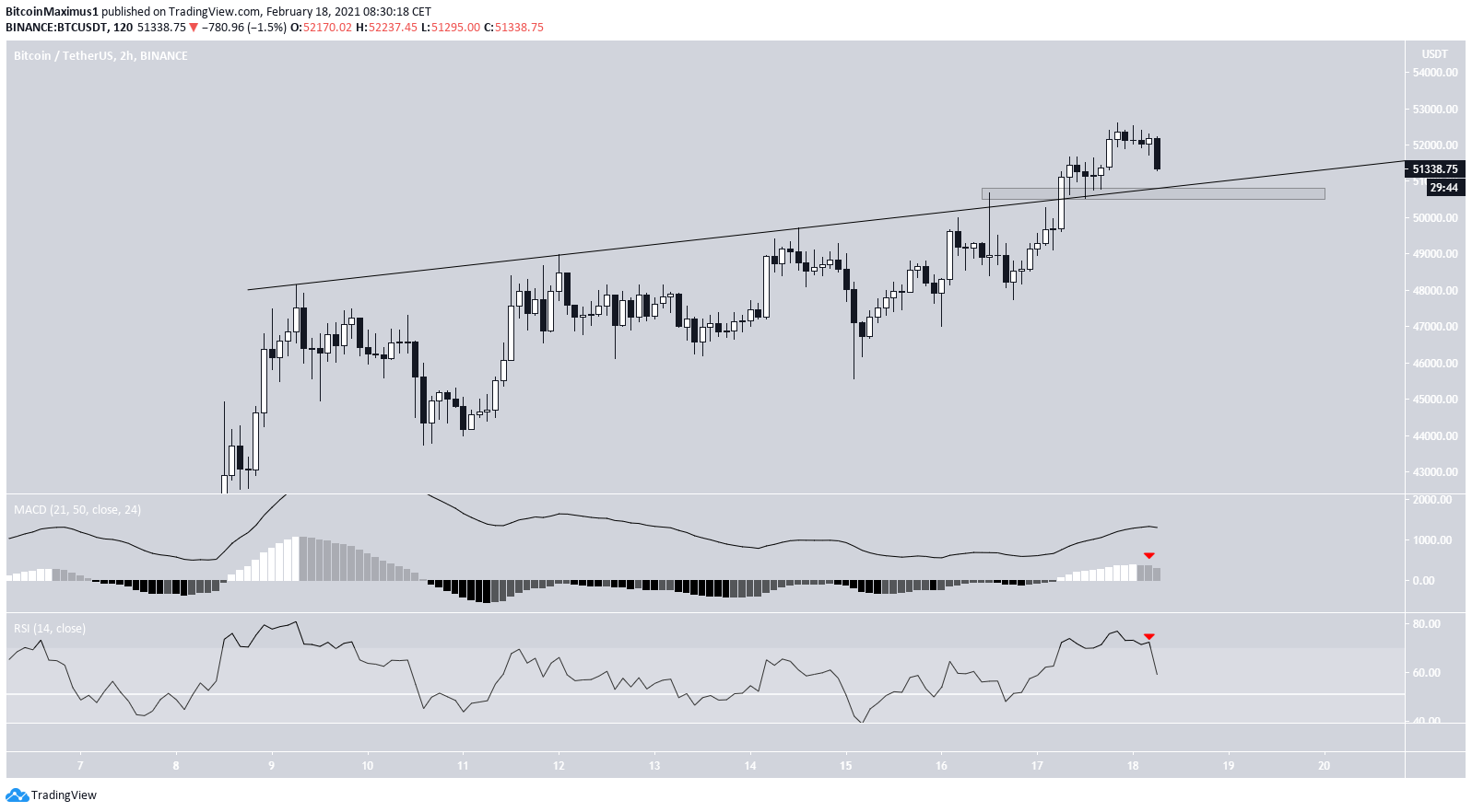 O gráfico de duas horas mostra que, apesar de sua falta de estrutura, o BTC está possivelmente corrigindo para validar a linha de resistência ascendente a partir da qual rompeu. A linha também quase coincide com a área de suporte de $ 50.700.
