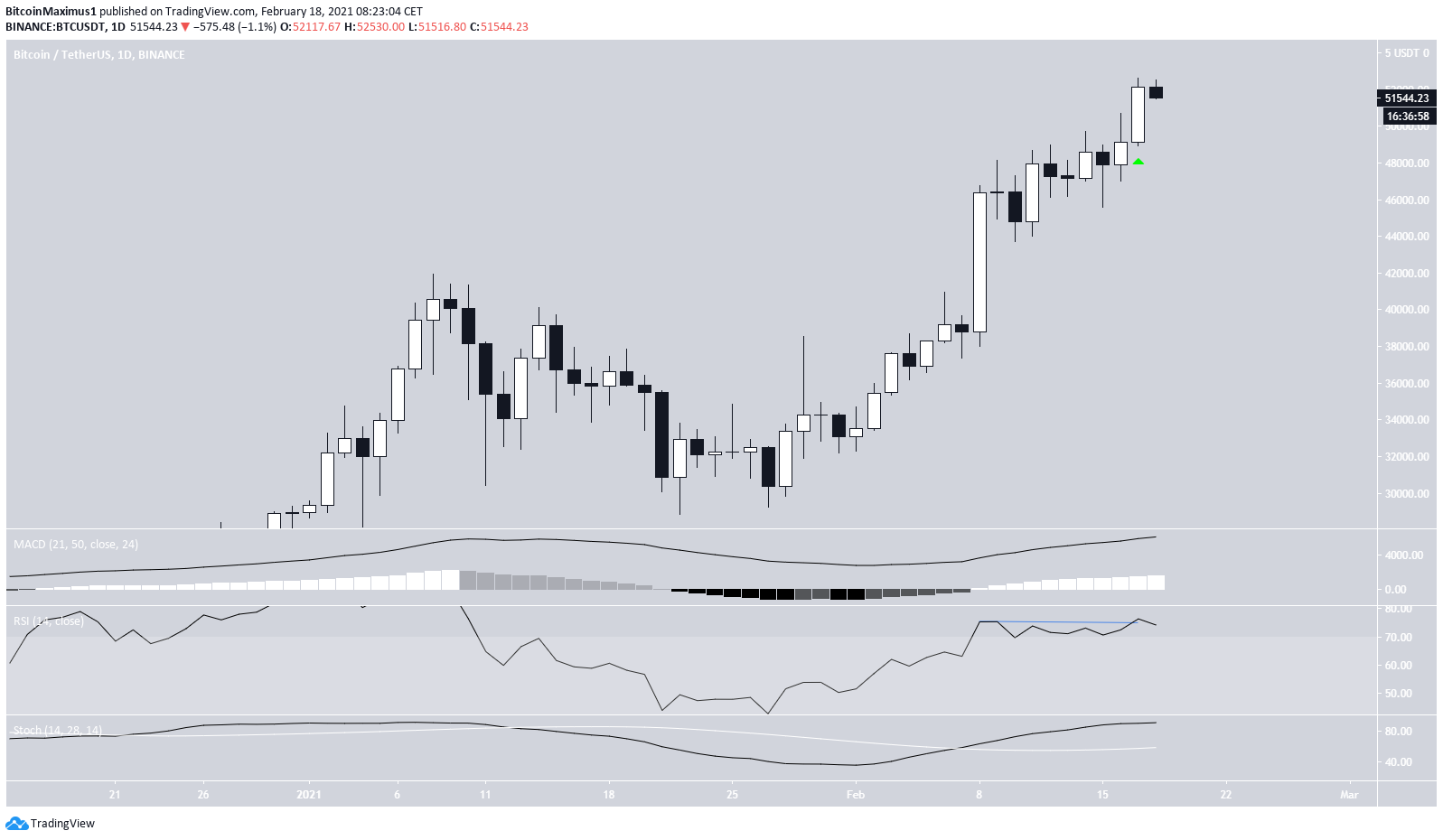 No dia 17 de fevereiro, o BTC criou um candle de alta, atingindo um novo preço máximo de $ 52.618. O movimento foi importante, pois sinalizou um rompimento confirmado acima da área de $ 50.000. O BTC vinha lutando para superar essa resistência nos últimos cinco dias.