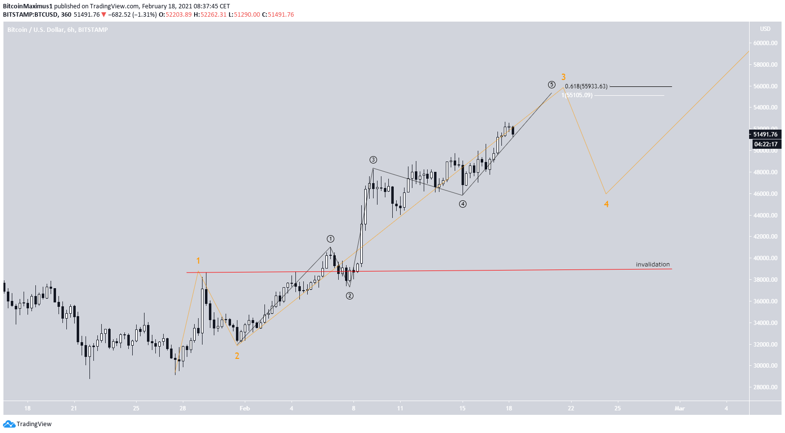 A contagem de ondas sugere que o BTC está se aproximando do topo da onda três (laranja), de um impulso de alta que começou no dia 27 de janeiro de 2021