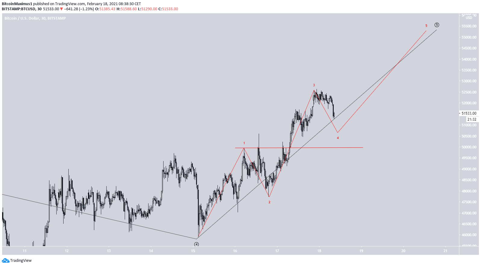Uma análise mais detalhada do gráfico de 30 minutos sugere que o BTC está de fato na parte final do movimento antes que uma correção comece.